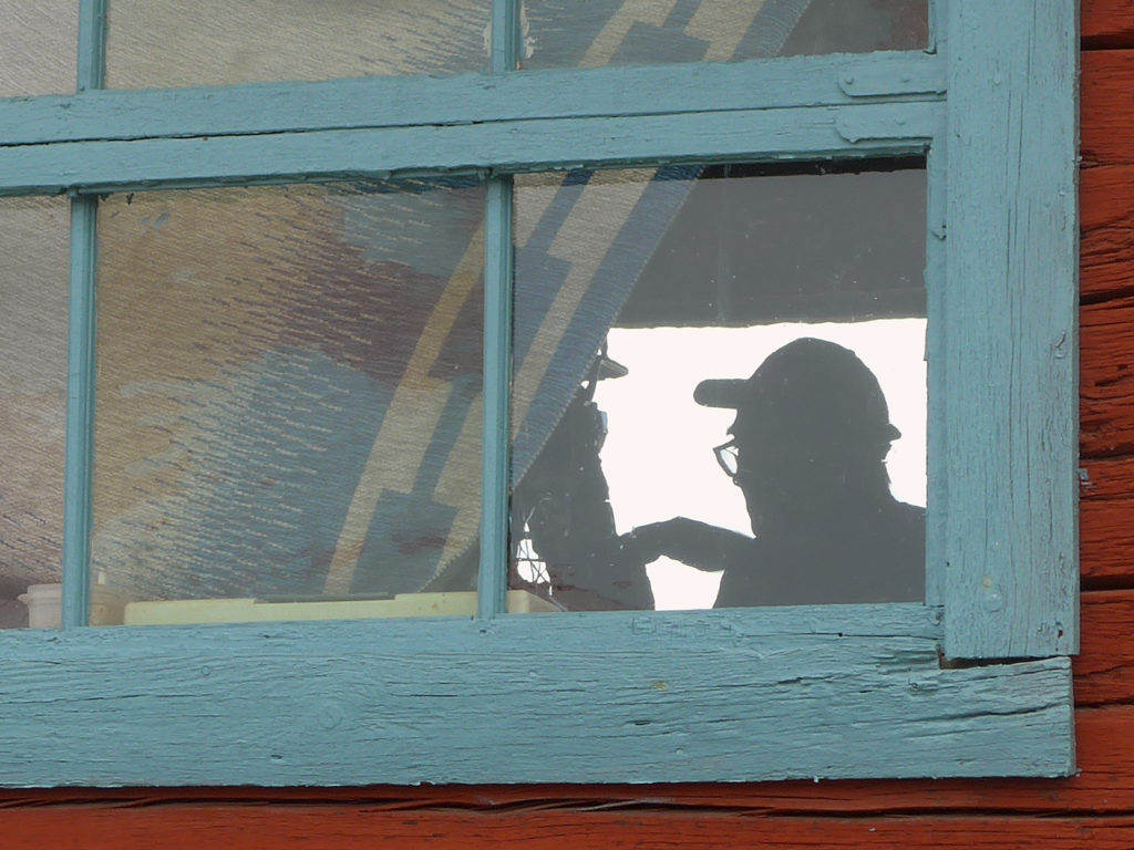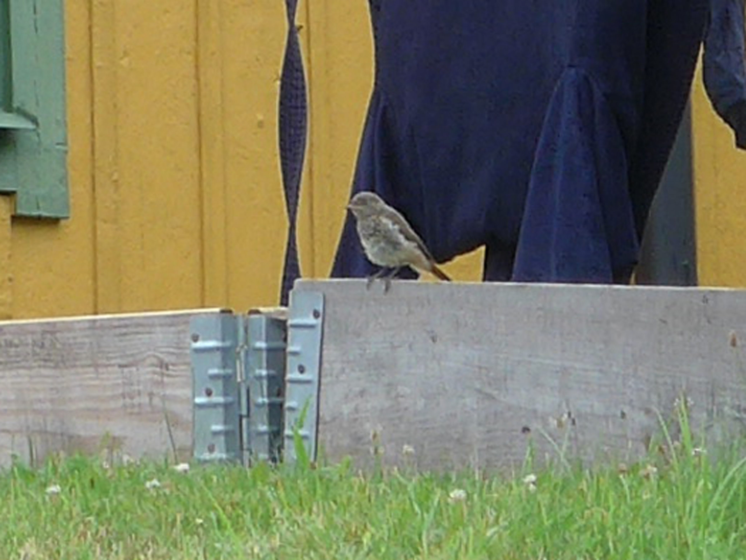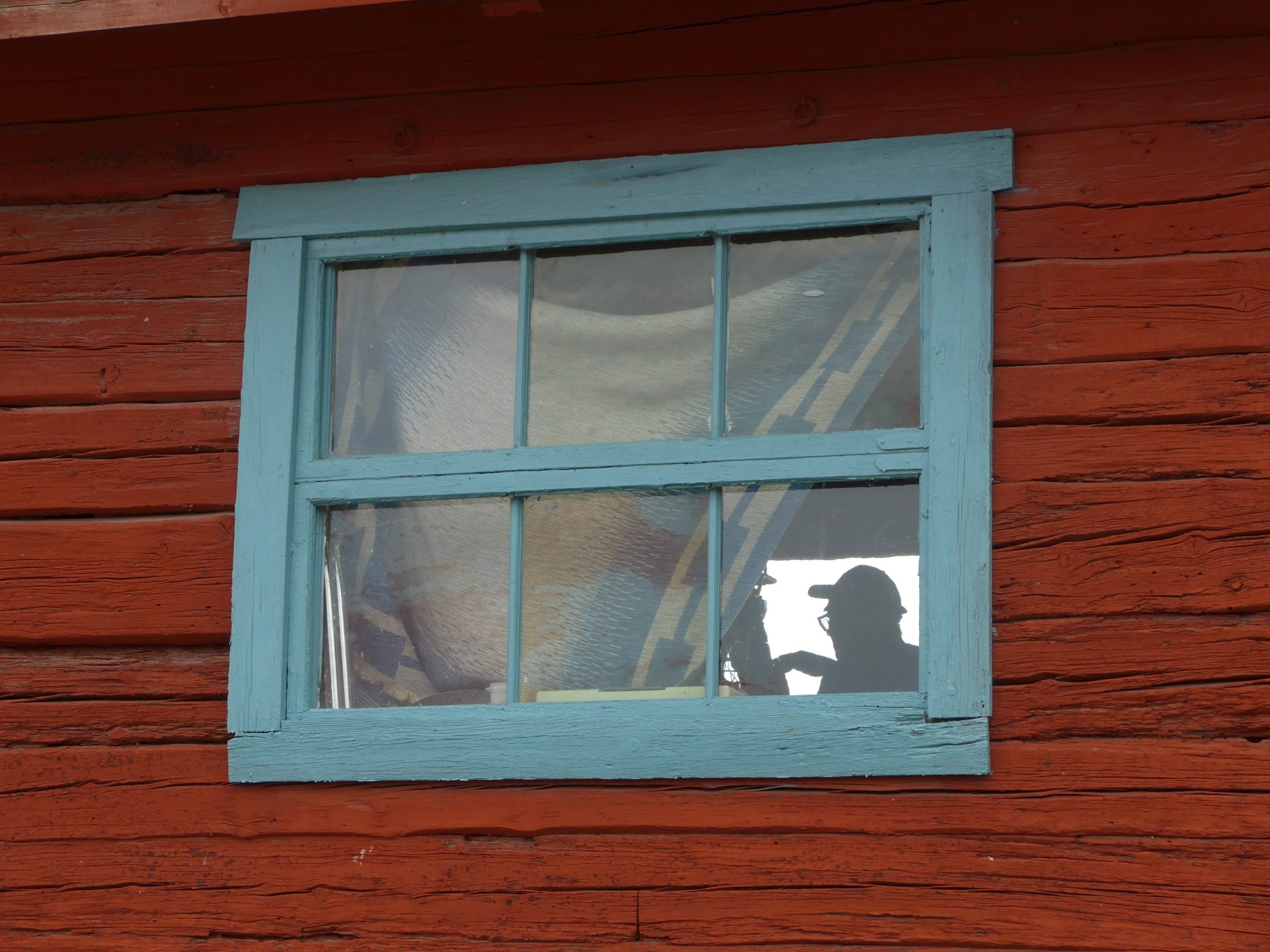 Gick runt i området för att se om jag kunde hitta den igen. Såg den några gånger till men tyvärr på alldeles för långt avstånd för att jag skulle kunna ta en bild. När jag var på väg tillbaka till parkeringen såg jag en siluett i ett fönster. Det var en man som meckade med en motorcykel så det fick bli dagens bild. Bilden är tagen med min kompaktkamera och är hårt beskuren. Precis när jag tagit bilden och vände mig om för att gå vidare satte sig den Svarta rödstjärten på en pallkrage och eftersom jag hade kameran framme så tog jag en bild trots att avståndet var stort.